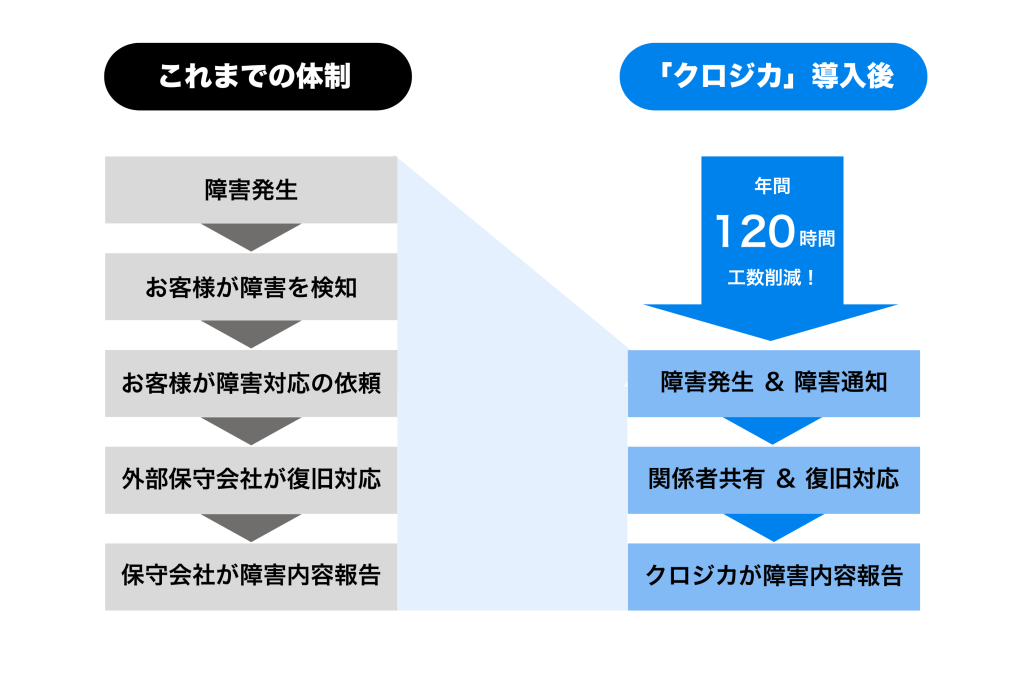 こうした状況を改善するためにクロジカサーバー管理を導入しました。導入後には、障害発生時の情報共有をBacklog※1で一元化し、運用フローを標準化したことで、 社内調整の負担が軽減されました。その結果、月間約10時間の工数削減や障害対応の迅速化、社内説明の容易化を実現しています。