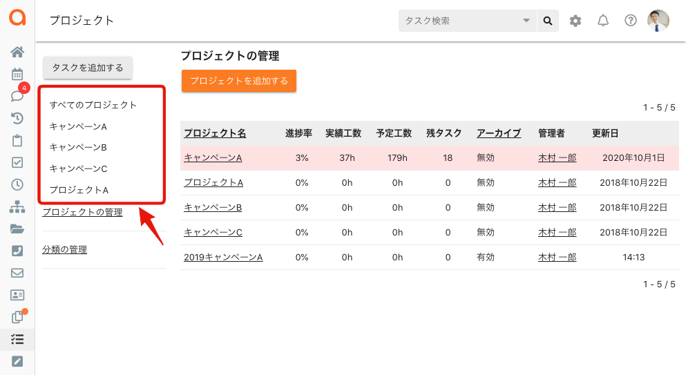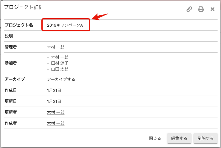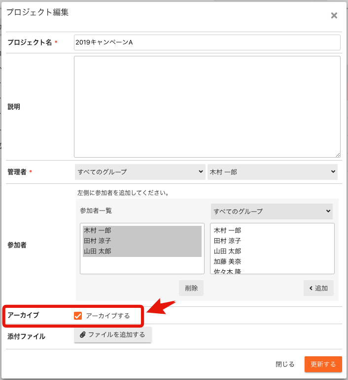 完了したプロジェクトをアーカイブする方法をご案内します。プロジェクト詳細より「編集する」を選択して「アーカイブする」にチェックを入れて→「更新する」をクリックしてください。プロジェクトをアーカイブすることで左メニューのプロジェクト一覧に表示されなくなります。アーカイブしたプロジェクトのタスクを確認する際には「プロジェクト管理」よりプロジェクト詳細画面のプロジェクト名をクリックします。回答が見つかりましたか? はい いいえ ご不明な点はチャットサポートで担当者がご説明します。お気軽にお問い合わせください。 クロジカスケジュール管理にログイン後の右上の「?」(サポートメニュー)からチャットをはじめることができます。 チャットで問い合わせる