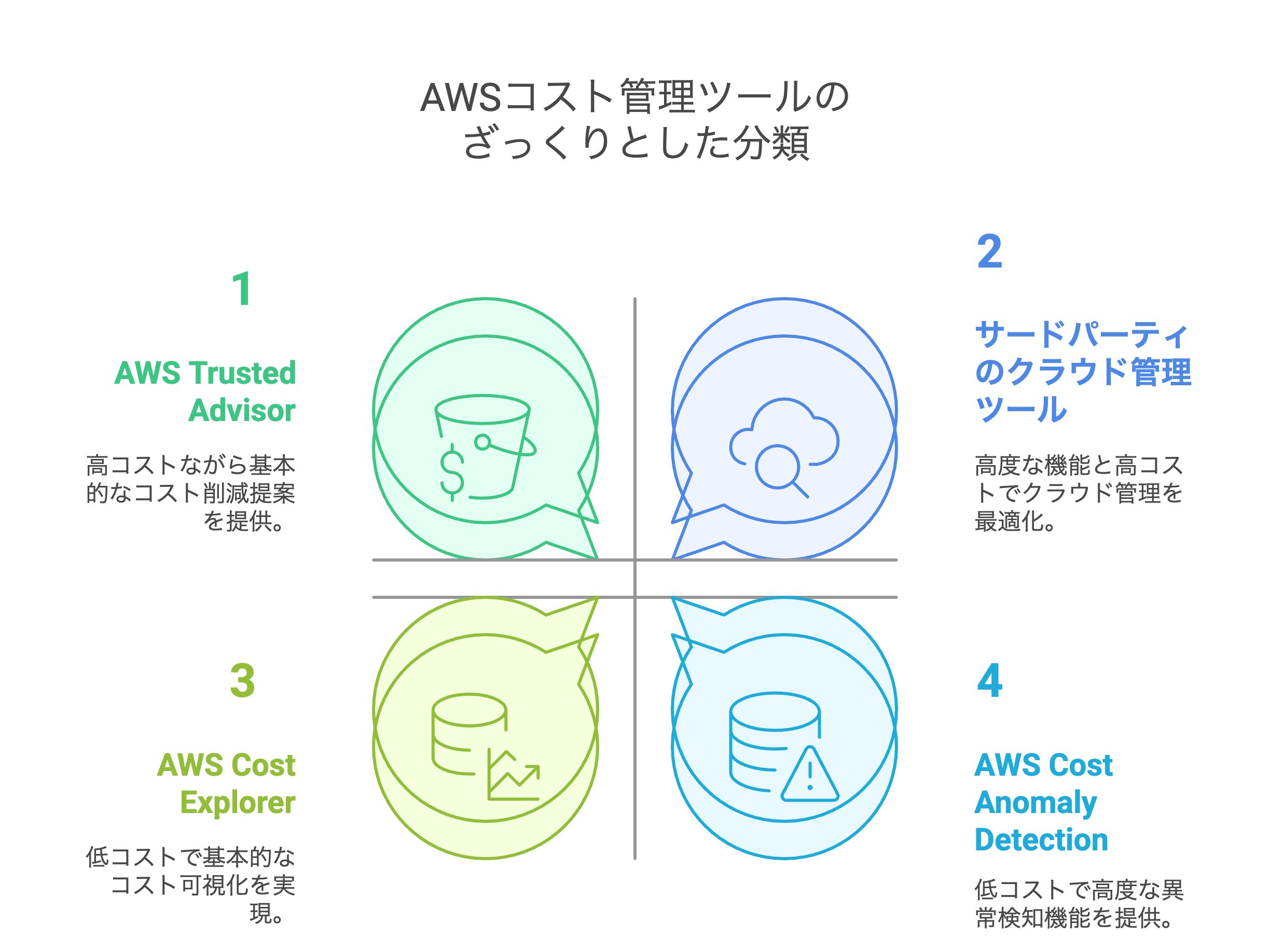 AWSでは公式・非公式を含め実に多くのコスト管理ツールが存在します。その代表例として、AWS公式のCost Explorer(コストの可視化ツール)、AWS Budgets(予算設定とアラート)、Cost and Usage Report(詳細なコストデータのエクスポート)などが挙げられます​。  さらにAWS利用状況を分析して最適化提案をくれるTrusted AdvisorやCompute Optimizer、機械学習で異常なコスト増を検知するCost Anomaly Detectionといったサービスもあります。また、サードパーティーからもCloudHealthやApptio、Flexeraなどの高度なクラウド費用管理サービスが提供されており​、選択肢は非常に豊富です。  実際、選択肢が多いこと自体は喜ばしいものの、AWSを利用し始めたユーザーにとっては、どれをどう使えば良いか分かりにくいという問題があります。例えば「コストを可視化したい」という場合、一口に可視化といってもCost Explorerでグラフを見る方法もあれば、エクスポートしたCost and Usage ReportをBIツールで分析する方法もあります。  また、Trusted Advisorはコスト削減の具体策を提案してくれますが、利用するには「ビジネス」以上の有償サポートプラン加入が必要です。こうした条件面の違いも含め、各ツールの特徴を理解して使い分けの方針を立てるのは容易ではありません。  解決策としては、目的別に適したツールを組み合わせて運用フローを確立することが求められます。例えば日常的なコスト監視にはCost ExplorerとBudgetsを使い、詳しい社内レポートにはCost and Usage Reportのデータを用いる、といった具合です。また、必要に応じてサードパーティー製品の導入も検討します。  自社の予算や体制に応じて利用可能なツールを精査し、「どのデータを誰がチェックし、異常時にどう対処するか」というプロセスを社内ルール化することが大切です。総じて、AWSのコスト管理ツールは数が多い分習熟に時間がかかります。しかしそれぞれの強みを活かせばコスト管理の手間を大幅に減らせるため、腰を据えて戦略的に取り組む価値があります。
